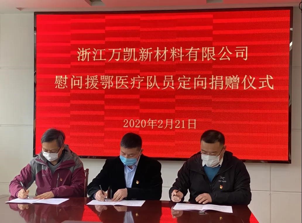 2月21日下午,浙江万凯新材料有限公司与海宁市红十字会、市卫生健康局签署三方协议,捐赠100万元定向用于海宁赴湖北医疗救援队的慰问,每人3万元慰问金。这是嘉兴市首次向援鄂医护人员实施定向捐赠。
